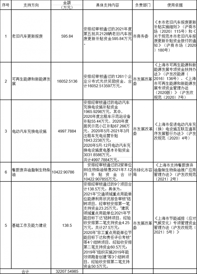 (四)按照《上海市支持餐廚廢棄油脂制生物柴油推廣應(yīng)用管理辦法》(滬發(fā)改規(guī)范〔2021〕2號)規(guī)定,安排經(jīng)審核通過的2家單位B5生物柴油銷售2021年7-12月補貼資金合計10422.907855萬元。