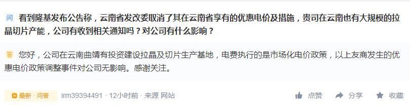 中環(huán)股份在接受媒體采訪時(shí)表示,云南取消隆基優(yōu)惠電價(jià)對(duì)公司沒(méi)有什么影響;而通威股份在接受媒體提問(wèn)時(shí)則回應(yīng)稱(chēng),“我們沒(méi)有收到相關(guān)的通知”。