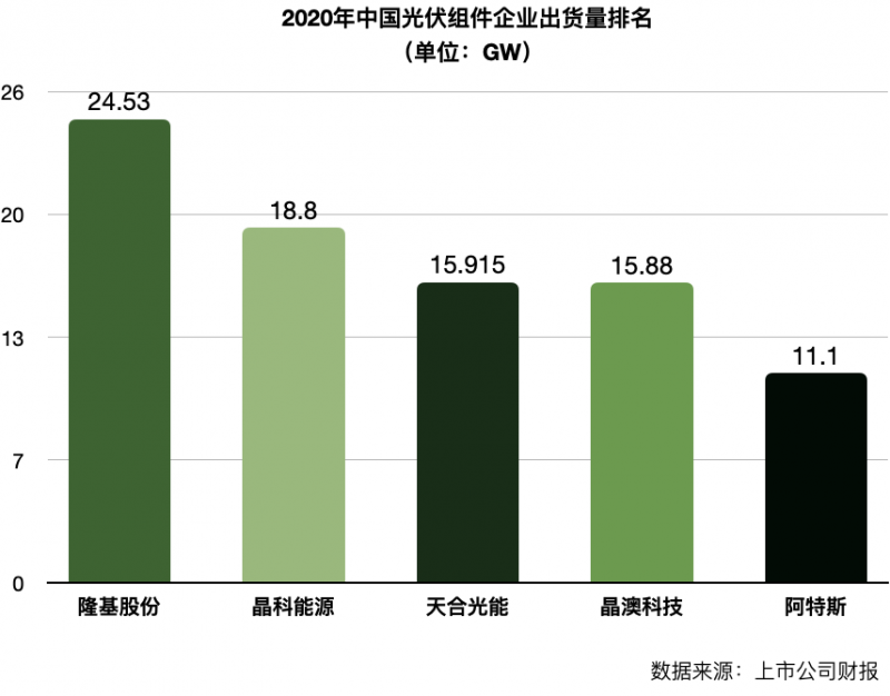 2020年,隆基股份組件出貨量爆增至24.53吉瓦,魚躍登上了全球光伏組件出貨排名的“鐵王座”,成為中國(guó)組建廠商的“執(zhí)牛耳者”。