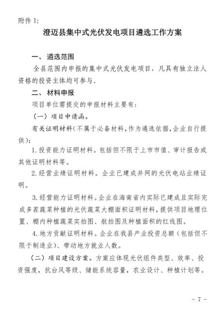 文件規(guī)定了澄邁縣集中式光伏發(fā)電項目應納入省內“十四五”能源發(fā)展規(guī)劃總規(guī)模,在全縣范圍內實行總量控制,每年新增建設的集中式光伏發(fā)電項目總規(guī)模原則上不超過10萬千瓦。對有建設需求的企業(yè),向縣發(fā)改委集中進行申報,通過組織比選的方式遴選綜合評價最高的項目實施。