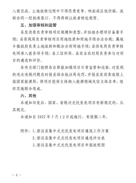 4月11日,澄邁縣發(fā)展和改革委員會、澄邁縣自然資源和規(guī)劃局、澄邁縣農業(yè)農村局、澄邁縣工業(yè)信息化和科學技術局聯合發(fā)布了《關于進一步規(guī)范集中式光伏發(fā)電項目建設管理的通知》。本通知自2022年5月12日起施行,有效期2年。