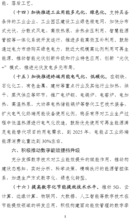 加快推進(jìn)終端用能電氣化、低碳化。在鋼鐵、石化化工、有色金屬、建材等重點行業(yè)及其他行業(yè)加熱、烘干、蒸汽供應(yīng)等環(huán)節(jié),推廣電爐鋼、電鍋爐、電窯爐、電加熱、高溫?zé)岜?、大功率電熱儲能鍋爐等替代工藝技術(shù)裝備,擴(kuò)大電氣化終端用能設(shè)備使用比例。穩(wěn)妥有序?qū)I(yè)生產(chǎn)過程中低溫?zé)嵩催M(jìn)行電氣化改造。鼓勵優(yōu)先使用可再生能源滿足電能替代項目的用電需求。到2025年,電能占工業(yè)終端能源消費(fèi)比重達(dá)到30%左右。