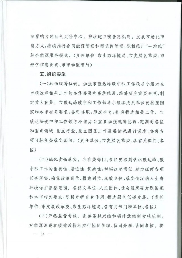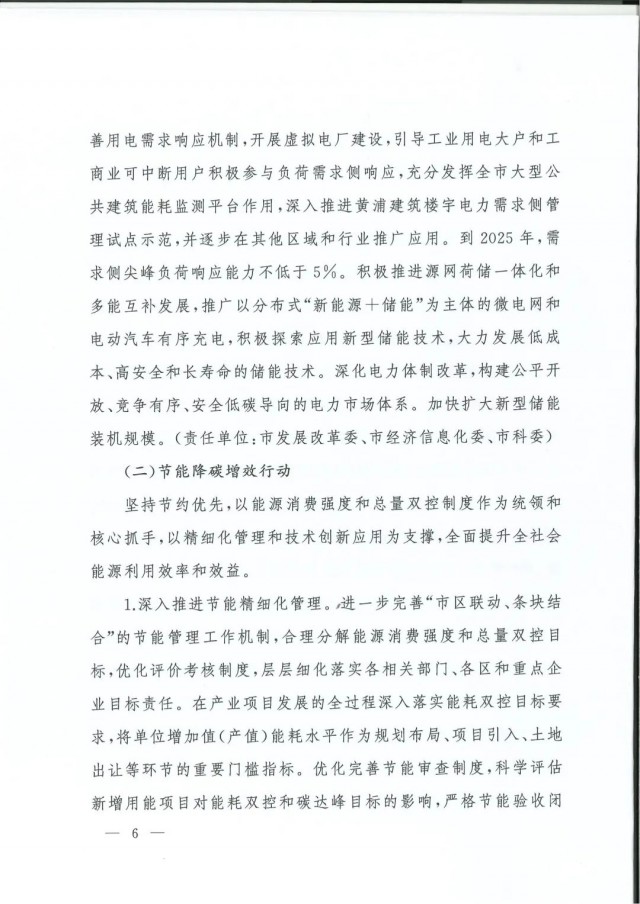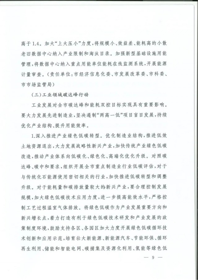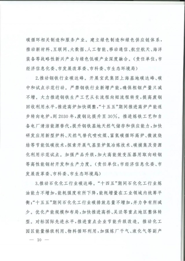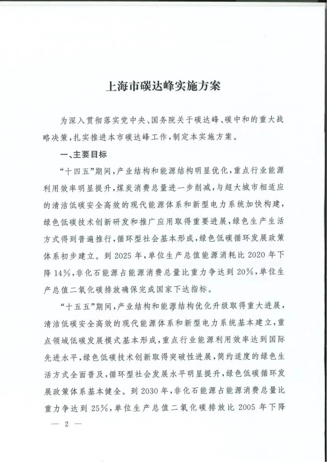近日,上海市人民政府辦公廳印發(fā)了《上海市碳達(dá)峰實(shí)施方案》?!斗桨浮访鞔_主要目標(biāo):到2025年,單位生產(chǎn)總值二氧化碳排放確保完成國(guó)家下達(dá)指標(biāo)。到2030年單位生產(chǎn)總值二氧化碳排放比2005年下降70%,確保2030年前實(shí)現(xiàn)碳達(dá)峰。并計(jì)劃組織實(shí)施“碳達(dá)峰十大行動(dòng)”,包括能源綠色低碳轉(zhuǎn)型行動(dòng)、節(jié)能降碳增效行動(dòng)、工業(yè)/城鄉(xiāng)建設(shè)/交通領(lǐng)域綠色低碳行動(dòng)、循環(huán)經(jīng)濟(jì)助力降碳行動(dòng)、綠色低碳科技創(chuàng)新行動(dòng)、碳匯能力鞏固提升行動(dòng)、綠色低碳全民行動(dòng)、綠色低碳區(qū)域行動(dòng)。