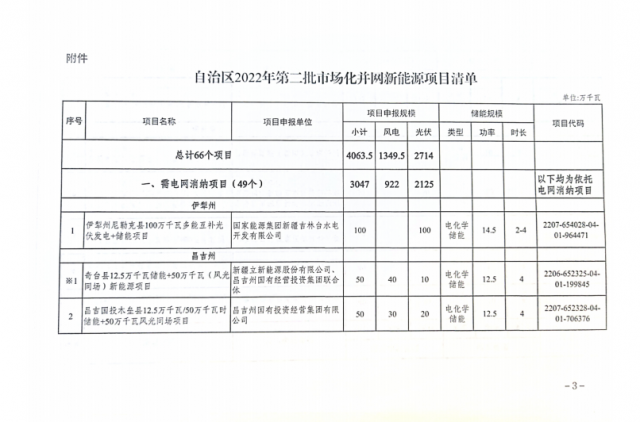新疆2022年第二批市場化并網(wǎng)新能源項目清單,總計66個項目,規(guī)模總計為40.63GW,其中光伏為27.14GW,風(fēng)電為13.49GW。