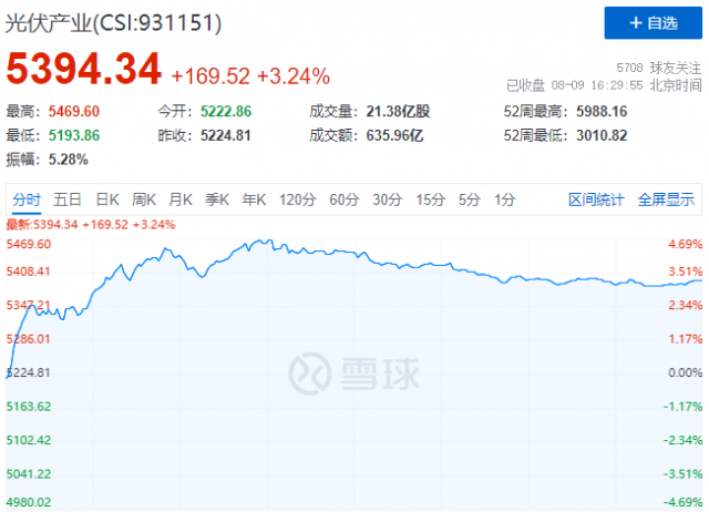 8月9日,調(diào)整一周有余的光伏板塊迎來全線反彈,個(gè)股呈現(xiàn)普漲態(tài)勢,中證光伏產(chǎn)業(yè)指數(shù)(CSI:931151)大漲3.24%,報(bào)收5394點(diǎn)。值得注意的是,近幾個(gè)交易日股價(jià)表現(xiàn)強(qiáng)勢的部分電池片概念股早盤出現(xiàn)沖高回落的情況,而近期股價(jià)表現(xiàn)較為萎靡的硅片等產(chǎn)業(yè)鏈上游個(gè)股卻集體大漲。