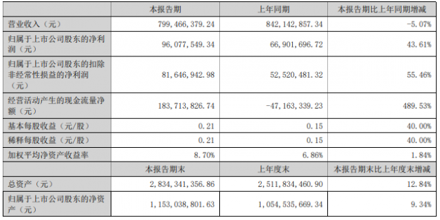 8月19日晚間,精功科技發(fā)布2022年半年度報(bào)告,報(bào)告期內(nèi),公司營(yíng)業(yè)收入799,466,379.24元,同比下降5.07%,歸屬于上市公司股東的凈利潤(rùn)96,077,549.34元,同比增加43.61%,詳情如下: