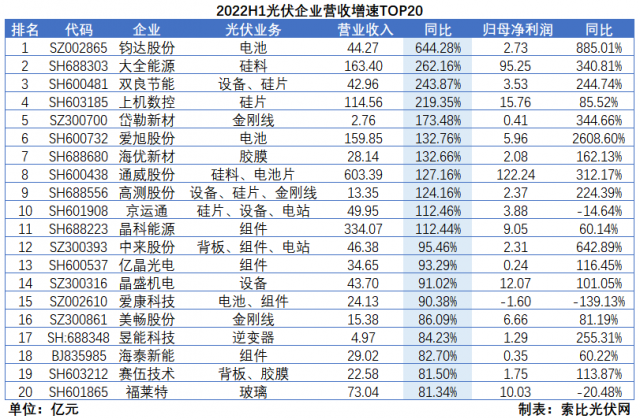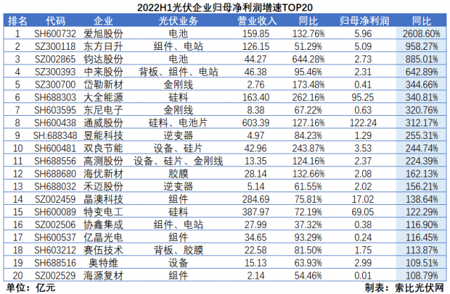 利潤增速方面,除了硅料企業(yè)延續(xù)高增長以外,去年因硅料價(jià)格暴漲而出現(xiàn)虧損的產(chǎn)業(yè)鏈中游專業(yè)化廠商,2022年上半年受益于供應(yīng)鏈管理能力的提升以及產(chǎn)品結(jié)構(gòu)的優(yōu)化,紛紛迎來困境翻轉(zhuǎn),其中愛旭股份、東方日升、中來股份的利潤增速分別達(dá)到2609%、958%和643%。此外,岱勒新材、東尼電子兩大金剛線廠商受益于硅片環(huán)節(jié)的擴(kuò)產(chǎn)以及細(xì)線化發(fā)展趨勢,疊加自身的產(chǎn)能擴(kuò)張和成本下降,利潤增速均超300%。