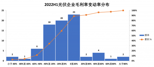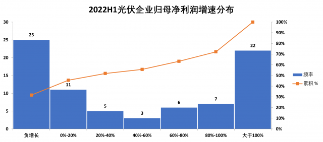 相比于營收的普漲態(tài)勢,光伏企業(yè)的經(jīng)營業(yè)績卻出現(xiàn)顯著分化。2022年上半年,79家光伏企業(yè)的歸母凈利潤總額達(dá)到650億元,平均增速為32%。其中,利潤負(fù)增長的企業(yè)占比高達(dá)32%,而業(yè)績翻倍增長的企業(yè)占比亦達(dá)到28%,呈現(xiàn)顯著的“兩極分化”態(tài)勢。不過,與2021年不同的是,產(chǎn)業(yè)鏈中游的諸多專業(yè)化廠商紛紛迎來“困境反轉(zhuǎn)”,而業(yè)績出現(xiàn)下滑的企業(yè)多為競爭力一般的中小市值企業(yè)。