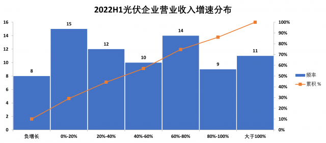 2022年上半年,79家光伏企業(yè)合計(jì)創(chuàng)收5571億元,平均增速(“平均”指“中位數(shù)”,下同)達(dá)到48%。令人欣喜的是,營收負(fù)增長的企業(yè)占比僅為10%,而營收增速超過40%的企業(yè)占比則高達(dá)71%。其中,除了硅料企業(yè)繼續(xù)保持高速增長以外,眾多“跨界者”也乘著光伏行業(yè)的“東風(fēng)”,迎來暴發(fā)式增長。