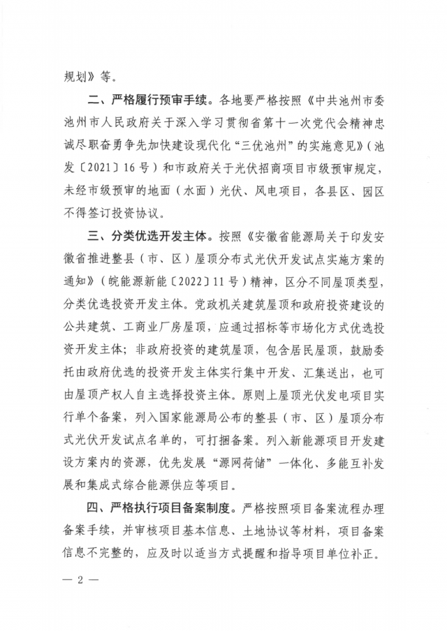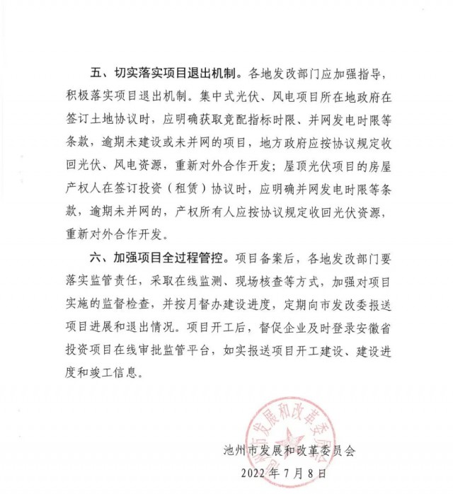 通知強(qiáng)調(diào):各地要嚴(yán)格按照《中共池州市委池州市人民政府關(guān)于深入學(xué)習(xí)貫徹省第十一次黨代會(huì)精神忠誠(chéng)盡職奮勇?tīng)?zhēng)先加快建設(shè)現(xiàn)代化“三優(yōu)池州”的實(shí)施意見(jiàn)》(池發(fā)(2021] 16號(hào))和市政府關(guān)于光伏招商項(xiàng)目市級(jí)預(yù)審規(guī)定,未經(jīng)市級(jí)預(yù)審的地面(水面)光伏、風(fēng)電項(xiàng)目,各縣區(qū)、園區(qū)不得簽訂投資協(xié)議。