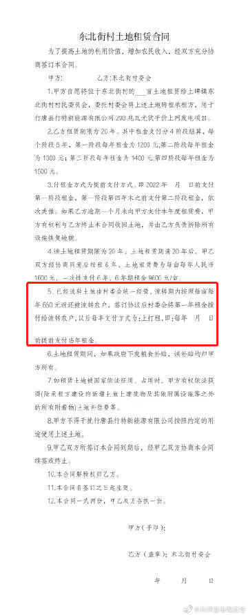 但是根據(jù)一份在網(wǎng)絡(luò)上流傳、未簽訂土地租賃合同文件,“已經(jīng)流轉(zhuǎn)土地由村委會(huì)統(tǒng)一經(jīng)營(yíng),流轉(zhuǎn)期內(nèi)按照每畝每年660元返還被流轉(zhuǎn)農(nóng)戶(hù)”。