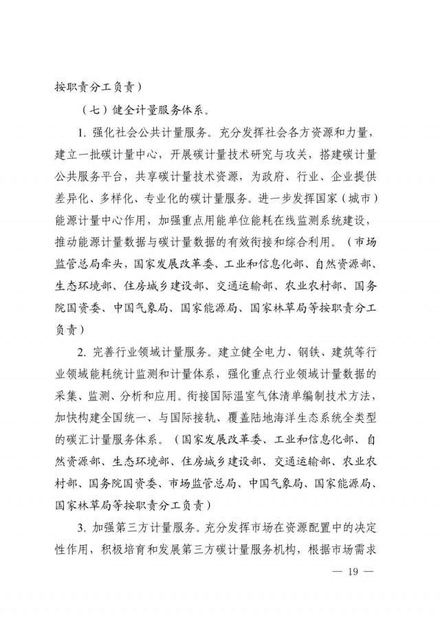 作為碳達(dá)峰碳中和“1+N”政策體系中重要文件之一,提出了完善碳排放基礎(chǔ)通用標(biāo)準(zhǔn)體系、加強(qiáng)重點(diǎn)領(lǐng)域碳減排標(biāo)準(zhǔn)體系建設(shè)、加快布局碳清除標(biāo)準(zhǔn)體系、健全市場化機(jī)制標(biāo)準(zhǔn)體系、完善計(jì)量技術(shù)體系、加強(qiáng)計(jì)量管理體系建設(shè)、健全計(jì)量服務(wù)體系7個方面的24項(xiàng)重點(diǎn)任務(wù),明確了實(shí)施碳計(jì)量科技創(chuàng)新工程、碳計(jì)量基礎(chǔ)能力提升工程、碳計(jì)量標(biāo)桿引領(lǐng)工程、碳計(jì)量精準(zhǔn)服務(wù)工程、碳計(jì)量國際交流合作工程5項(xiàng)重點(diǎn)工程,開展雙碳標(biāo)準(zhǔn)強(qiáng)基行動、百項(xiàng)節(jié)能降碳標(biāo)準(zhǔn)提升行動、低碳前沿技術(shù)標(biāo)準(zhǔn)引領(lǐng)行動、綠色低碳標(biāo)準(zhǔn)國際合作行動4項(xiàng)重點(diǎn)行動,并對協(xié)調(diào)推動各項(xiàng)工作落實(shí)提出相應(yīng)要求。