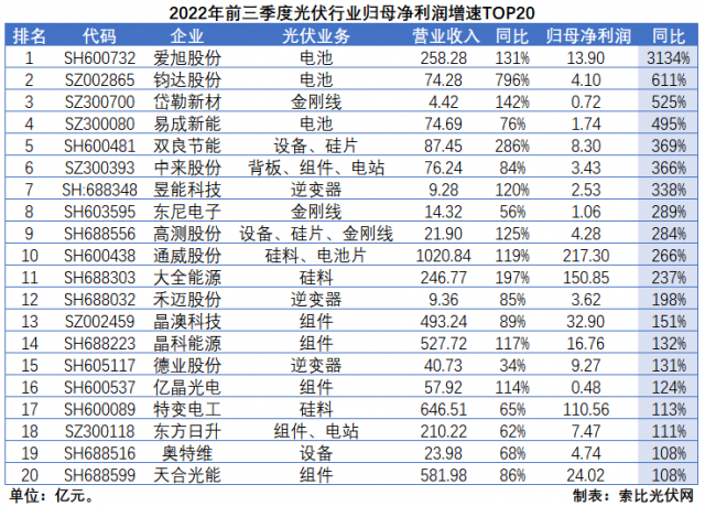 2022年前三季度,在整個(gè)A股市場一片“哀嚎”之際,光伏行業(yè)依然延續(xù)高速增長態(tài)勢。根據(jù)索比光伏網(wǎng)的統(tǒng)計(jì)數(shù)據(jù)顯示,80家光伏概念股營收增速和歸母凈利潤增速中值分別達(dá)到51%和40%;營業(yè)收入和歸母凈利潤呈增長態(tài)勢的企業(yè)分別達(dá)到71家和57家,占比高達(dá)89%和71%。