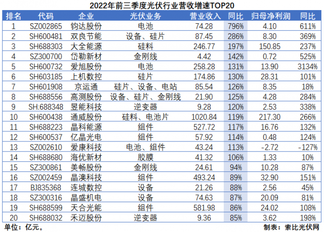 從營收規(guī)模來看,硅料和組件依然是創(chuàng)收能力最強(qiáng)的環(huán)節(jié)。而且,多數(shù)企業(yè)前三季度營業(yè)收入均已超過2021年全年,且創(chuàng)歷史新高。其中,通威股份營收規(guī)模首次突破千億大關(guān),達(dá)到1021億元;隆基綠能二、三季度邊際改善顯著,環(huán)比增速分別達(dá)到71%和15%,營收規(guī)模達(dá)到870.35億元;特變電工受益于硅料、煤炭產(chǎn)品的“量價(jià)齊升”,達(dá)到646.51億元。