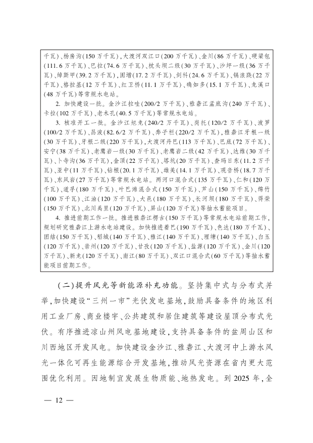 提升風光等新能源補充功能。堅持集中式與分布式并舉,加快建設“ 三州一市” 光伏發電基地,鼓勵具備條件的地區利用工業廠房、商業樓宇、公共建筑和居住建筑等建設屋頂分布式光伏。有序推進涼山州風電基地建設,支持具備條件的盆周山區和川西地區開發風電。加快建設金沙江、雅礱江、大渡河中上游水風光一體化可再生能源綜合開發基地,推動風光資源在省內更大范圍優化利用。因地制宜發展生物質能、地熱發電。到2025年,全省光伏發電、風電裝機分別新增2004萬千瓦、473萬千瓦,分別達2200萬千瓦、1000萬千瓦以上。