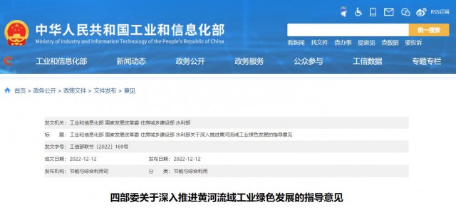 12月12日,工信部、國家發改委、住建部、水利部四部委發布《關于深入推進黃河流域工業綠色發展的指導意見》。