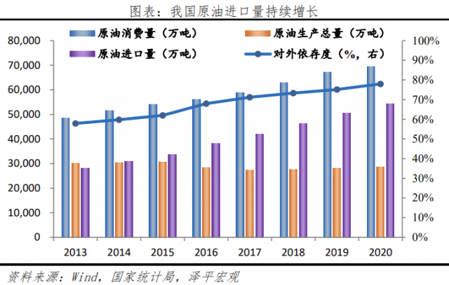 二是對國家能源安全的保障。在交通運輸領域,我國石油消費量正不斷走高,從2015年的5.43億噸/年上升至2020年的7.36億噸/年。然而我國原油產量則一直維持在2億噸/年。供需矛盾致使我國的原油進口量持續增長,對外依存度超過70%。為保證國家的能源安全和經濟的可持續發展,能源消費結構亟需升級。而發展新能源發電有利于減少我國對能源進口的依賴,保障國家能源安全。