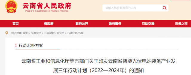 云南省工業和信息化廳等五部門關于印發云南省智能光伏電站裝備產業發展三年行動計劃(2022—2024年)的通知
