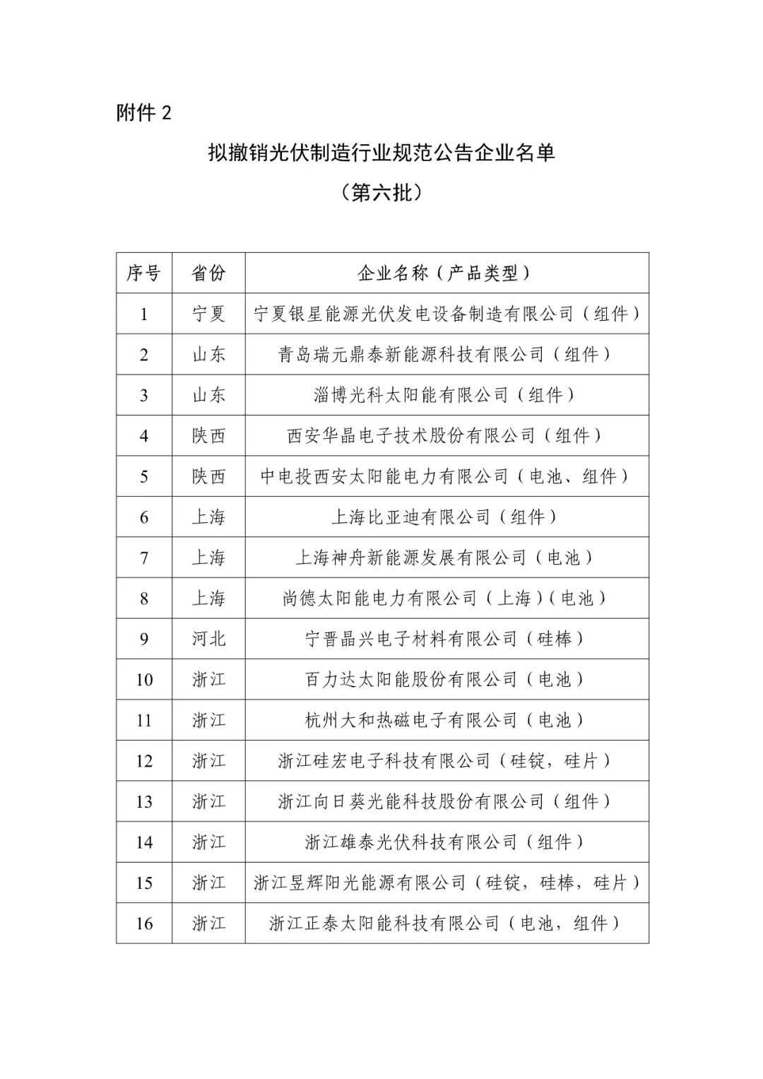 寧夏銀星能源光伏發(fā)電設(shè)備制造有限公司等16家已公告企業(yè),因不能保持規(guī)范條件要求,擬撤銷其規(guī)范條件企業(yè)名單,一并予以公示(見(jiàn)附件2)。