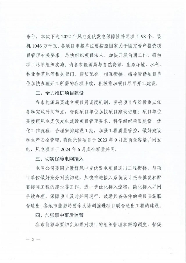 具體看,保障性并網(wǎng)項(xiàng)目98個(gè),裝機(jī)1046萬(wàn)千瓦(10.46GW)。其中,光伏項(xiàng)目68個(gè),裝機(jī)741萬(wàn)千瓦(7.41GW),風(fēng)光儲(chǔ)一體項(xiàng)目2個(gè),裝機(jī)共25萬(wàn)千瓦。要求確保光伏項(xiàng)目于2023年9月底前全容量并網(wǎng)發(fā)電。
