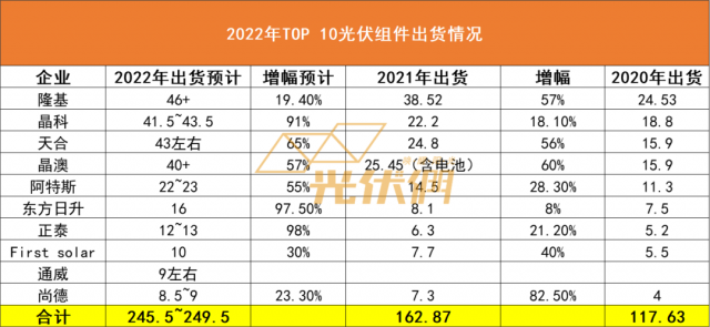 市場規(guī)模刷新紀錄的同時,龍頭企業(yè)組件出貨規(guī)模也在快速攀升。近日,光伏們通過企業(yè)內(nèi)部咨詢、第三方統(tǒng)計機構(gòu)以及券商公開資料統(tǒng)計了2022年TOP 10組件出貨情況,10家企業(yè)合計出貨規(guī)模約為250GW,其中,前四家組件企業(yè)的出貨數(shù)據(jù)愈發(fā)膠著,排名爭奪戰(zhàn)一觸即發(fā)。