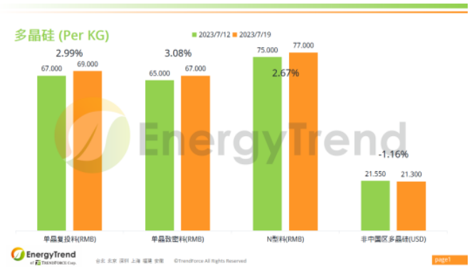 根據(jù)集邦咨詢旗下新能源研究中心集邦新能源網(wǎng)(EnergyTrend)2023年7月19日的報(bào)價(jià),單晶復(fù)投料人民幣價(jià)格為 RMB69/KG,增幅為 2.99%;單晶致密料人民幣最新價(jià)格為 RMB67/KG,較上周增長(zhǎng)了 3.08%。N型料人民幣報(bào)價(jià)從 RMB75/KG 增長(zhǎng)至 RMB77/KG,漲幅為 2.67%。非中國(guó)區(qū)多晶硅料美金價(jià)格為 US$21.3/KG。