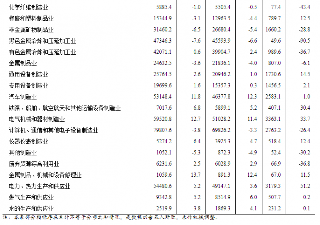 1—7月份,在41個工業(yè)大類行業(yè)中,13個行業(yè)利潤總額同比增長,28個行業(yè)下降。主要行業(yè)利潤情況如下:電力、熱力生產(chǎn)和供應(yīng)業(yè)利潤總額同比增長51.2%,電氣機械和器材制造業(yè)增長33.7%,通用設(shè)備制造業(yè)增長14.5%,專用設(shè)備制造業(yè)增長2.1%,汽車制造業(yè)增長1.0%,石油和天然氣開采業(yè)下降11.4%,紡織業(yè)下降20.3%,煤炭開采和洗選業(yè)下降26.2%,計算機、通信和其他電子設(shè)備制造業(yè)下降26.4%,非金屬礦物制品業(yè)下降28.8%,農(nóng)副食品加工業(yè)下降32.6%,有色金屬冶煉和壓延加工業(yè)下降36.7%,化學原料和化學制品制造業(yè)下降54.3%,石油、煤炭及其他燃料加工業(yè)下降87.0%,黑色金屬冶煉和壓延加工業(yè)下降90.5%。