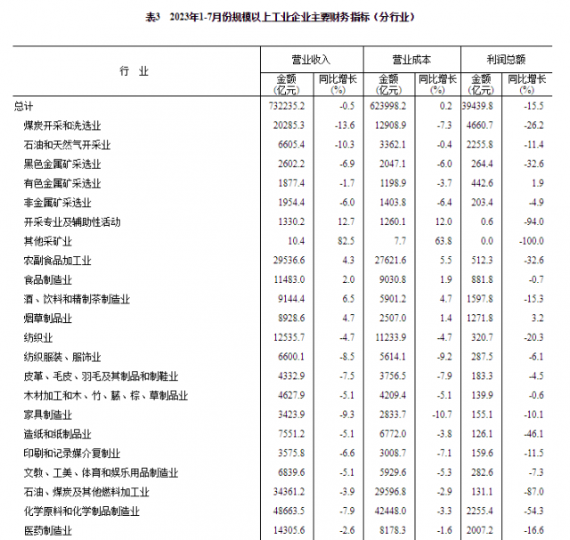 1—7月份,規(guī)模以上工業(yè)企業(yè)實現(xiàn)營業(yè)收入73.22萬億元,同比下降0.5%;發(fā)生營業(yè)成本62.40萬億元,增長0.2%;營業(yè)收入利潤率為5.39%,同比下降0.95個百分點。