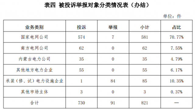 從被投訴舉報(bào)對(duì)象看,供電企業(yè)733件、占投訴舉報(bào)總數(shù)的89.28%,其中國家電網(wǎng)公司581件、占比70.77%,南方電網(wǎng)公司62件、占比7.55%,內(nèi)蒙古電力公司35件、占比3.65%,其他地方電力企業(yè)55件、占比6.17%;承裝(修、試)電力設(shè)施企業(yè)85件、占比10.35%;其他市場主體3件、占比0.37%。