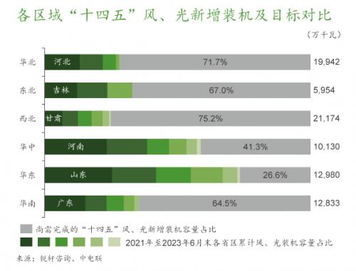 目前,河南及福建兩省已完成“十四五”新增風、光裝機目標。除此之外,大部分省區(qū)的光伏發(fā)電裝機完成度高于風電。