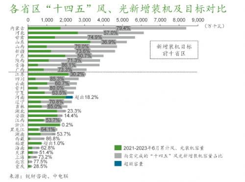 目前,共計7省區(qū)的新增風、光并網(wǎng)容量占其目標的25%以下,包括內(nèi)蒙古、山西、青海、四川等地。除此之外,甘肅、新疆等風、光大省的目標完成度也遠低于預期。