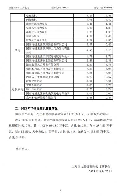 裝機方面,截至2023年8月底,公司控股裝機容量為2128.26萬千瓦,清潔能源占裝機規(guī)模的53.73%,其中:煤電984.80萬千瓦、占比46.27%,氣電287.52萬千瓦、占比13.51%,風(fēng)電392.41萬千瓦、占比18.44%,光伏發(fā)電463.53萬千瓦、占比21.78%。