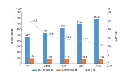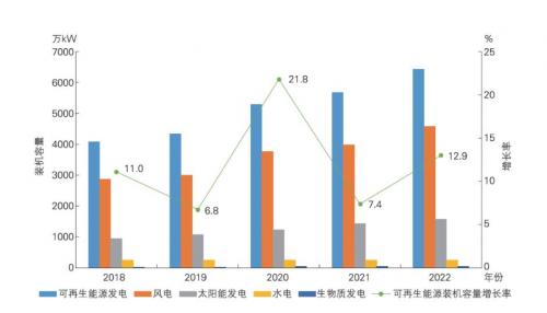 2018-2022年可再生能源裝機(jī)容量及年增長(zhǎng)率變化對(duì)比