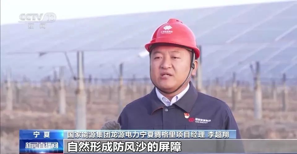 國家能源集團(tuán)龍?jiān)措娏幭尿v格里項(xiàng)目經(jīng)理 李超翔:我們通過建設(shè)光伏陣列自然形成防風(fēng)沙的屏障,并采用在地表扎草方格,實(shí)現(xiàn)防沙、固沙、治沙。在一期光伏項(xiàng)目2.8萬畝占地面積中,治沙范圍已超過2.6萬畝。