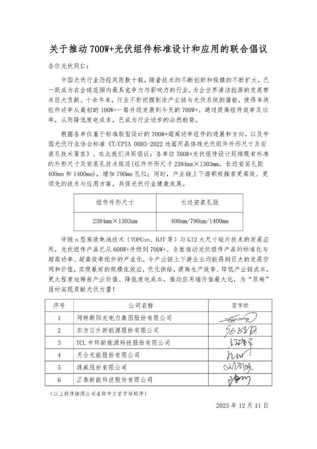 12月11日阿特斯陽光電力集團(tuán)、東方日升、TCL中環(huán)、天合光能、通威股份、正泰新能等公司發(fā)布聯(lián)合倡議,推動700W+光伏組件標(biāo)準(zhǔn)設(shè)計(jì)和應(yīng)用。倡議提出,各單位700W+光伏組件設(shè)計(jì)延續(xù)既有標(biāo)準(zhǔn)的外形尺寸及安裝孔技術(shù)規(guī)范(組件外形尺寸2384mm×1303mm,長邊安裝孔距400mm和1400mm),增加790mm孔位;同時(shí),產(chǎn)業(yè)鏈上下游積極探索更高效、更領(lǐng)先的技術(shù)與應(yīng)用方案,共促光伏行業(yè)健康發(fā)展。