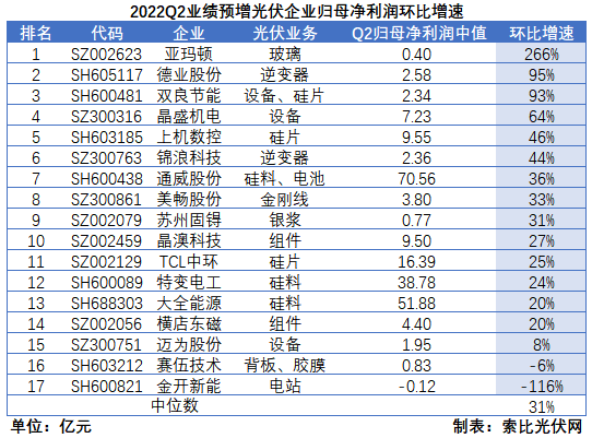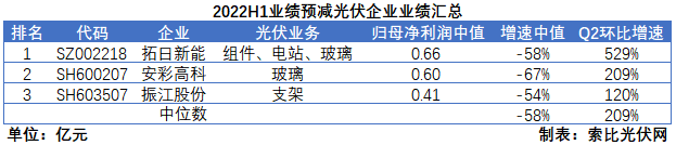 業(yè)績預(yù)減企業(yè)中,主要以光伏玻璃和光伏支架企業(yè)為主,業(yè)績降幅中值達(dá)到58%。其中,光伏玻璃企業(yè)主要受到去年一季度光伏玻璃價(jià)格處于高位的影響。PV Infolink數(shù)據(jù)顯示,2022年上半年2.0鍍膜玻璃平均價(jià)格為20.61元/平方米,較去年同期的26.62元/平方米下降23%。不過,從二季度的環(huán)比增速來看,3家企業(yè)的邊際改善較為顯著,中值達(dá)到209%,下半年的經(jīng)營業(yè)績有望持續(xù)提升。