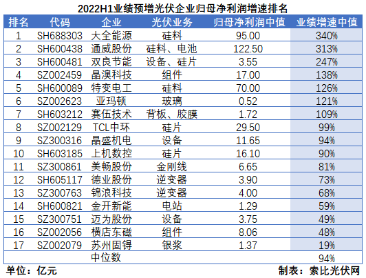 截至7月15日,兩市共有29家光伏企業(yè)發(fā)布2022年半年度業(yè)績預(yù)告。其中,預(yù)增企業(yè)17家,扭虧企業(yè)5家,預(yù)減企業(yè)3家,預(yù)虧企業(yè)4家。硅料、硅片以及設(shè)備企業(yè)業(yè)績增速居前,而受硅料價(jià)格暴漲影響較大的專業(yè)化電池及組件企業(yè)經(jīng)營業(yè)績則出現(xiàn)顯著分化。