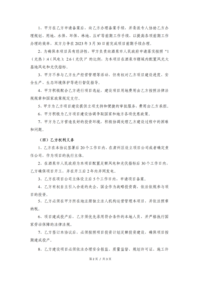 同時為確保本項目具有經(jīng)濟(jì)性,酒泉市肅州區(qū)人民政府負(fù)責(zé)向酒泉市人民政府申請落實按照“1(光熱):4(風(fēng)電):2.6(光伏)”的比例,為本項目在酒泉市轄域內(nèi)配置風(fēng)光大基地風(fēng)電和光伏指標(biāo)。