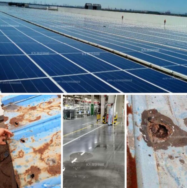 若只依靠彩鋼瓦本身的屋面,很容易因?yàn)橥繉雍穸炔粔?,加之紫外線、雨水、光合作用等自然因素的侵蝕,造成屋面彩鋼瓦接縫處開裂、鉚釘松動(dòng)生銹、屋面銹蝕擴(kuò)大、瓦脊銹蝕銹穿導(dǎo)致屋面出現(xiàn)滲水漏水的情況。同時(shí)因其坡度小,可能會(huì)造成雨水排泄不暢、積水超過彩鋼瓦接縫高度或鉚釘孔高度及溝沿瓦而導(dǎo)致銹損滲漏。而工廠生產(chǎn)過程中排放的酸性、堿性等氣體長期與屋面接觸,也會(huì)腐蝕鋼結(jié)構(gòu),加速銹蝕、穿孔導(dǎo)致滲漏。