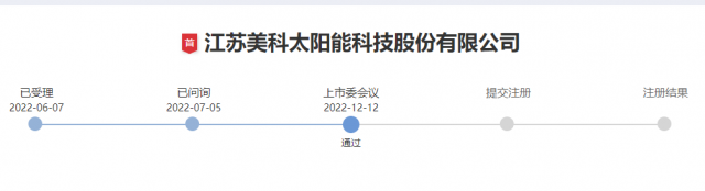 12月12日,據(jù)創(chuàng)業(yè)板上市委員會(huì)2022年第85次審議會(huì)議結(jié)果公告,江蘇美科太陽能科技股份有限公司(以下簡稱“美科股份”)首發(fā)上市獲得通過,成為2022年過會(huì)的第399家企業(yè)。