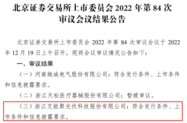 12月19日晚間,北京證券交易所上市委員會(huì)2022年第84次審議會(huì)議結(jié)果出爐,浙江艾能聚光伏科技股份有限公司(簡稱“艾能聚”)符合發(fā)行條件、上市條件和信息披露要求,成功過會(huì)。