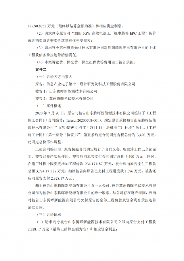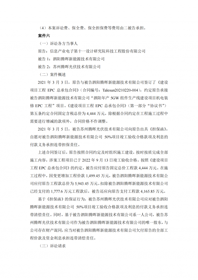2020年~2021年期,十一科技與蘇州騰暉的六家全資子公司泗陽騰暉光電有限公司、山東騰暉新能源技術有限公司、沛縣騰暉新能源技術有限公司、宿遷騰暉新能源技術有限公司、山東騰暉光電有限公司、泗陽騰暉新能源技術有限公司簽訂了多筆項目施工承包合同,但上述六家企業(yè)并未全部付清工程款。