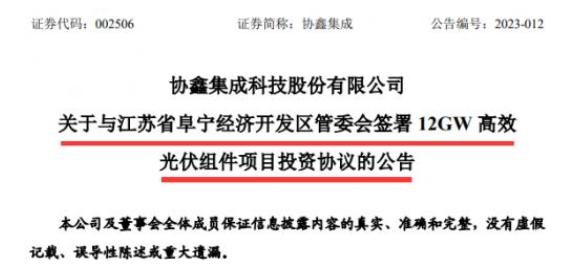 2月15日,協(xié)鑫集成發(fā)布公告稱,該公司擬在江蘇省阜寧經(jīng)濟(jì)開發(fā)區(qū)投資建設(shè)12GW高效光伏組件項(xiàng)目。