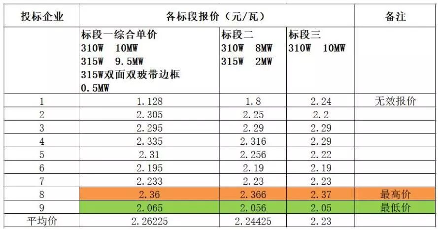 從開標(biāo)價格可以看出,除去無效報價,三個標(biāo)段的最低價格為2.05元/瓦,最高報價為2.37元/瓦,平均價格集中在2.2-2.3元/瓦。