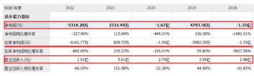 可以看到,在近五年里,該公司扣非凈利潤(rùn)除2021年稍有盈余以外,基本年份都處于虧損狀態(tài),而2021年?duì)I收也達(dá)到近5年新高。然而到2022年又迅速大跌至1.91億元的同期低谷。業(yè)績(jī)“坐過山車”也讓該公司備受資本市場(chǎng)的質(zhì)疑。