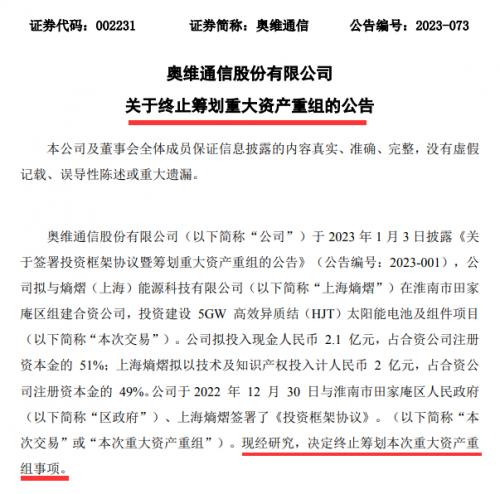 近日,奧維通信發(fā)布公告稱,公司原擬與熵熠(上海)能源科技有限公司(以下簡(jiǎn)稱“上海熵熠”)在淮南市田家庵區(qū)組建合資公司,投資建設(shè)5GW高效異質(zhì)結(jié)(HJT)太陽(yáng)能電池及組件項(xiàng)目。鑒于交易各方未能就交易對(duì)價(jià)、業(yè)績(jī)承諾、投后管理等交易方案的核心條款達(dá)成一致意見,為保證各方的利益,決定終止本次重大資產(chǎn)重組事項(xiàng)。
