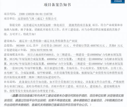 8月3日,通遼市扎魯特旗發(fā)展和改革委員會(huì)就遠(yuǎn)景通遼風(fēng)光制氫氨醇一體化項(xiàng)目發(fā)布《項(xiàng)目備案告知書》。