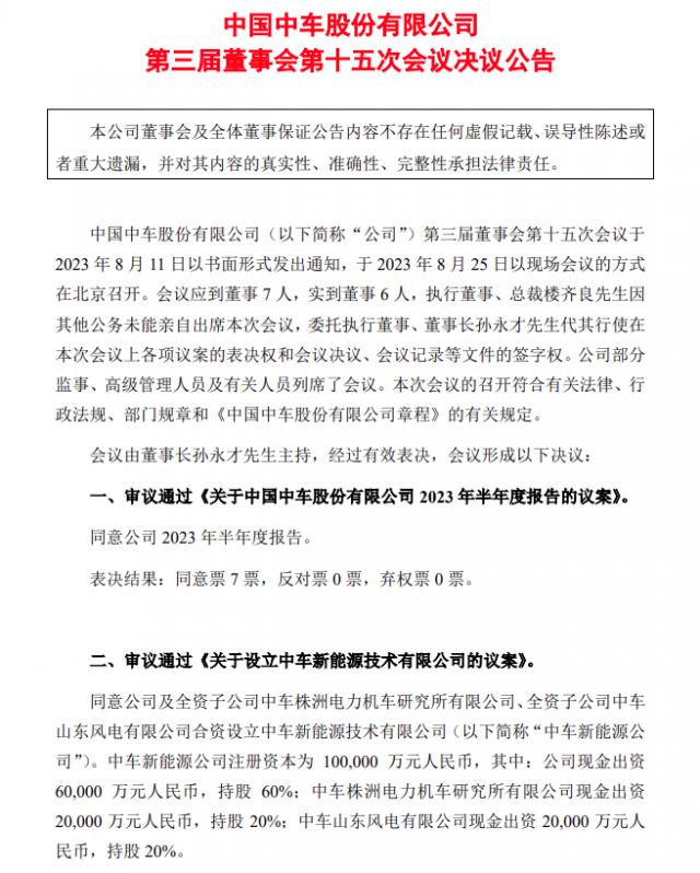 8月25日,中國中車發(fā)布第三屆董事會第十五次會議決議公告。其中董事會審議通過了《關(guān)于設(shè)立中車新能源技術(shù)有限公司的議案》,同意公司及全資子公司中車株洲電力機車研究所有限公司、全資子公司中車山東風(fēng)電有限公司合資設(shè)立中車新能源技術(shù)有限公司(以下簡稱“中車新能源公司”)。
