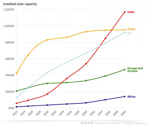近年來,印度光伏市場發(fā)展迅速,光伏裝機始終保強勁增長。截至2023年6月30日,印度可再生能源發(fā)電的累計裝機容量達到129.6GW,太陽能約占可再生能源總裝機容量的54%。美國能源信息署(IEA) 《國際能源展望》報告預測稱,至2050年,印度的太陽能裝機容量將在全球占據主導地位。