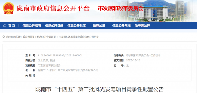 12月16日,隴南市發布“十四五”第二批風光發電項目競爭性配置公告。